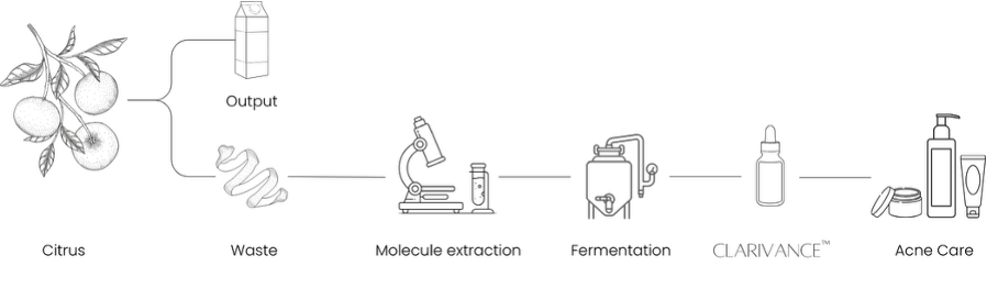 Each year, 60–70 million tons of citrus peel waste are produced globally. Fermentation transforms this renewable feedstock into a high-purity monoterpenoid active, combining efficacy with minimal environmental footprint. By replacing petrochemical synthesis, Clarivance™ enables a traceable, 100% bio-based production process, meeting clean label requirements for premium cosmetic brands.