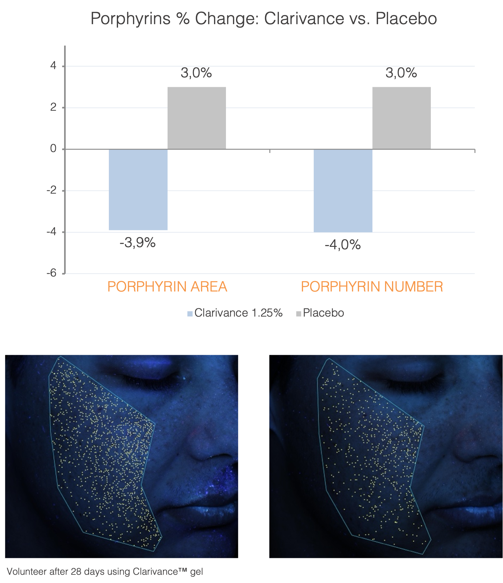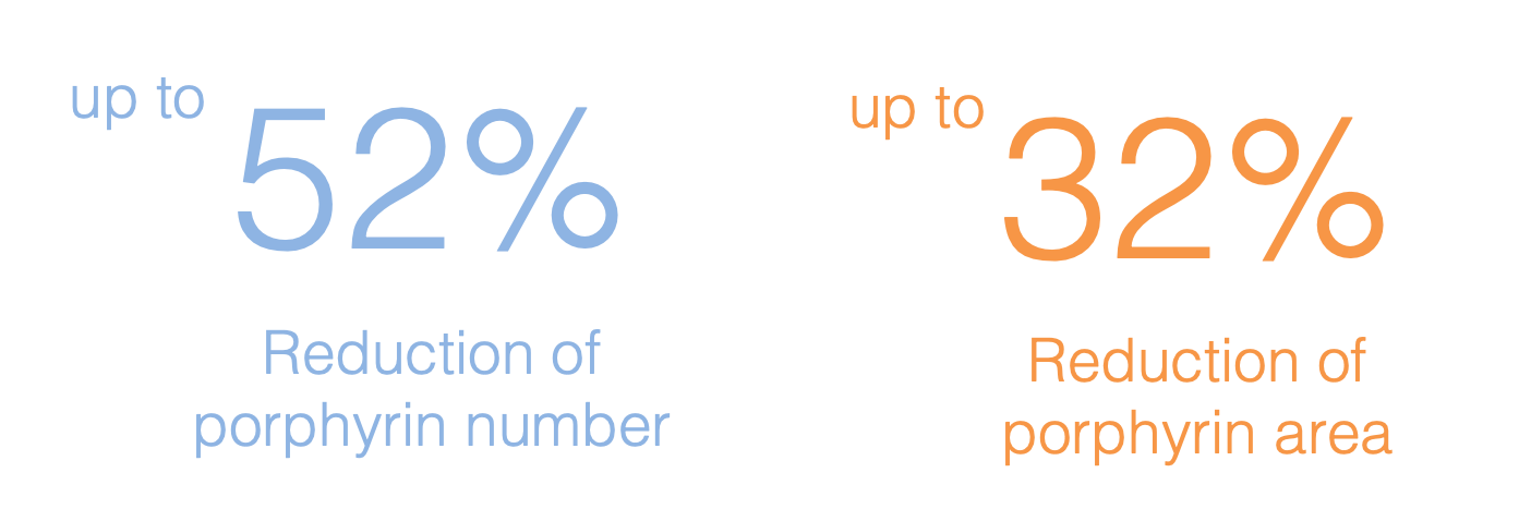 Porphyrins are produced by acne-causing bacteria – higher levels indicate greater bacterial C. acnes activity. Porphyrins are therefore considered a biological marker of acne severity. Clarivance™ at 1.25% reduced porphyrin area number, while placebo saw increases in both.